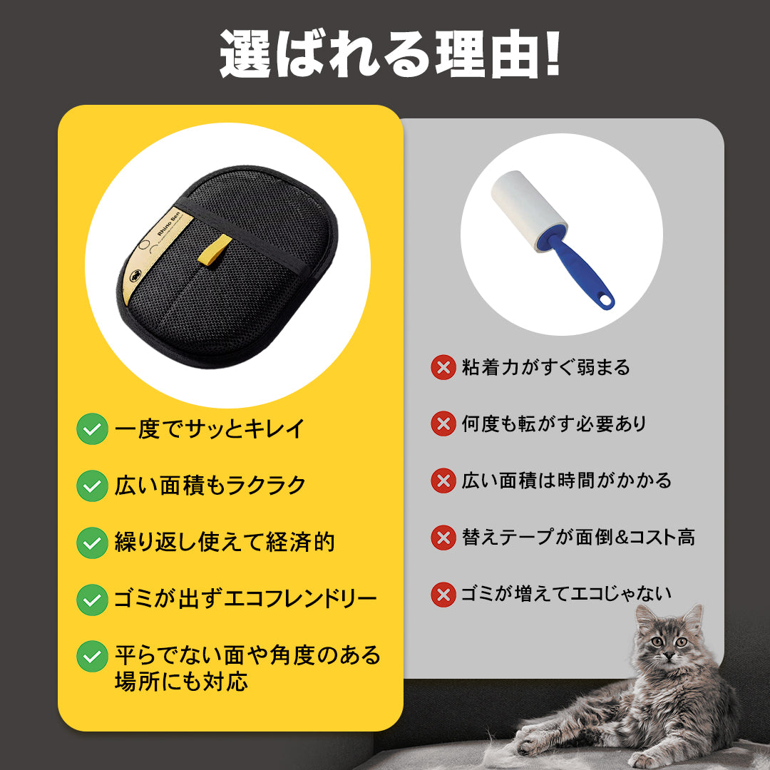 うちは猫が2匹いるんですが、この商品は本当に便利!家具の毛があっという間にキレイになります。品質もいいし、値段もお手頃。すごく満足しています!友達にもおすすめしたいです。